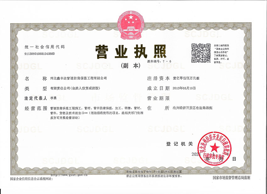 河北鑫豐達(dá)管道防腐保溫工程有限公司坐落于滄州市開發(fā)區(qū),通過ISO9000質(zhì)量管理體系認(rèn)證。本廠擁有工程師4名、技術(shù)人員30名,員工60人,注冊(cè)資金5500萬元。專門從事3pe/2pe防腐鋼管、保溫防腐鋼管、防腐螺旋鋼管、水泥砂漿防腐鋼管、等配套工程施工,以及防腐材料研發(fā)制造的大型專業(yè)化企業(yè)。是河北省防腐保溫行業(yè)協(xié)會(huì)理事單位。年生產(chǎn)能力500萬平方米。